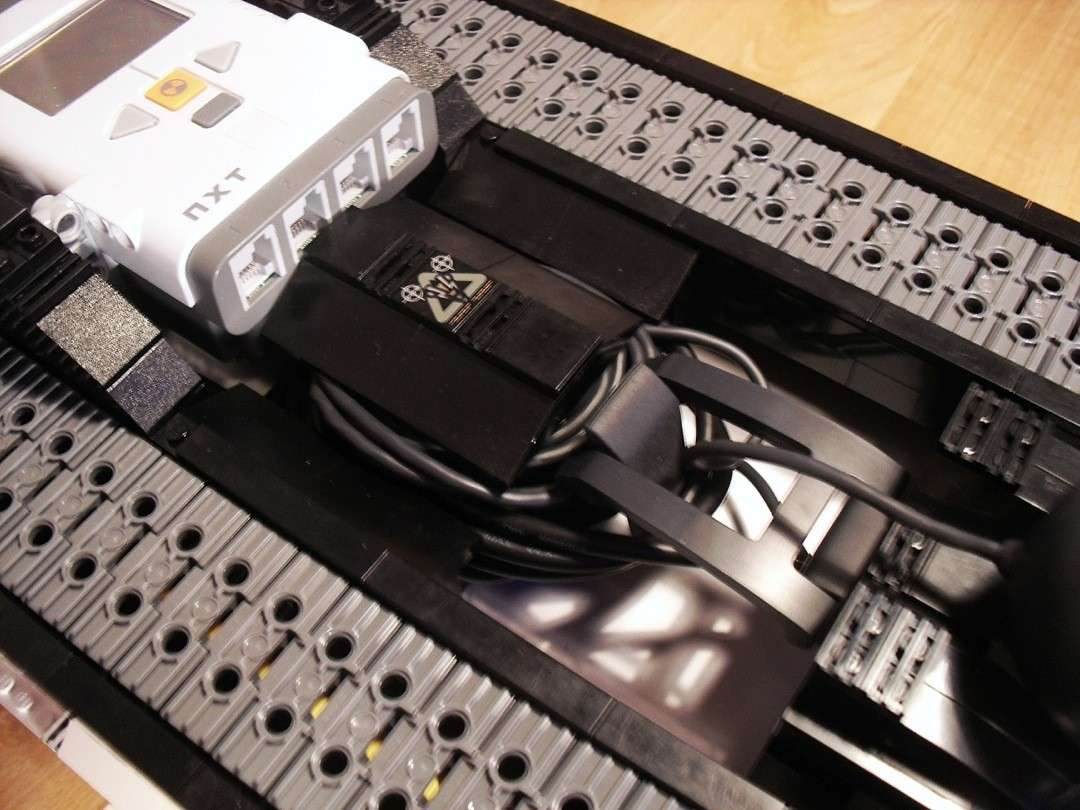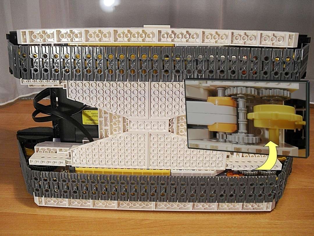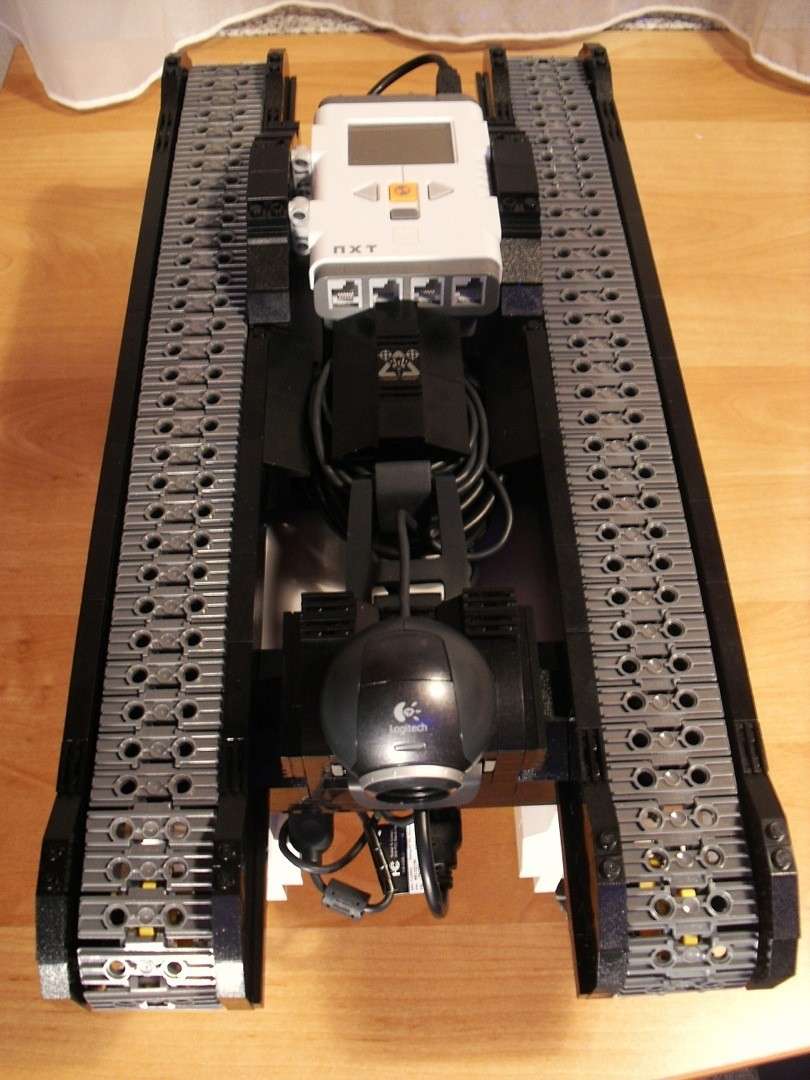 Dieses Kettenfahrzeug entstand aus der Idee heraus, einen fernsteuerbaren Lego-Roboter zu bauen. Ich baute also Kettenungetüm um ein Netbook herum. Letzteren verband ich per USB mit dem NXT-Stein. Dieser steuert die Motoren des Fahrzeugs. Weiterhin baute ich auf der Forderseite eine Webcam an, und verband diese ebenfalls mit dem Netbook.