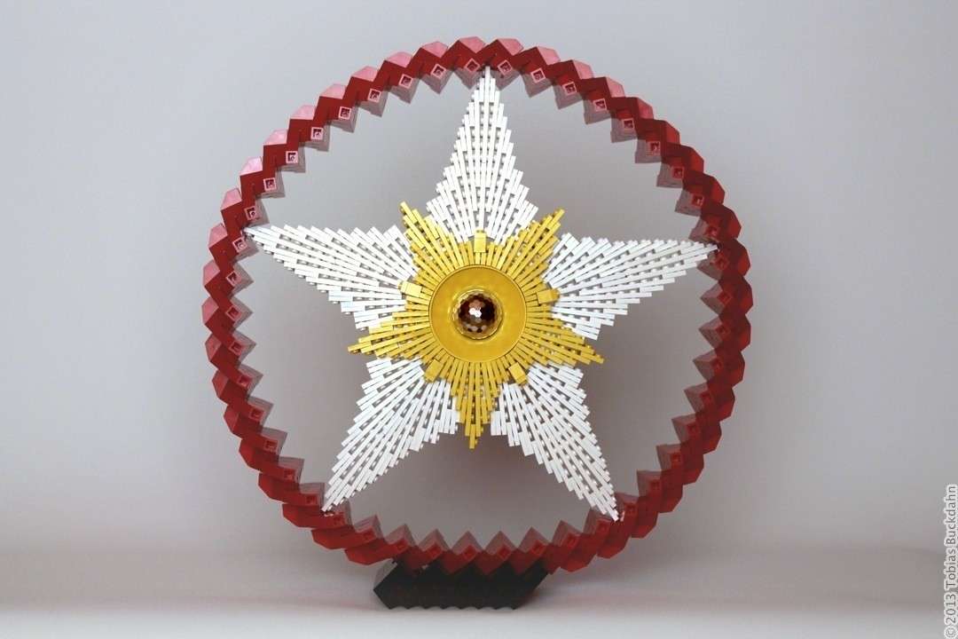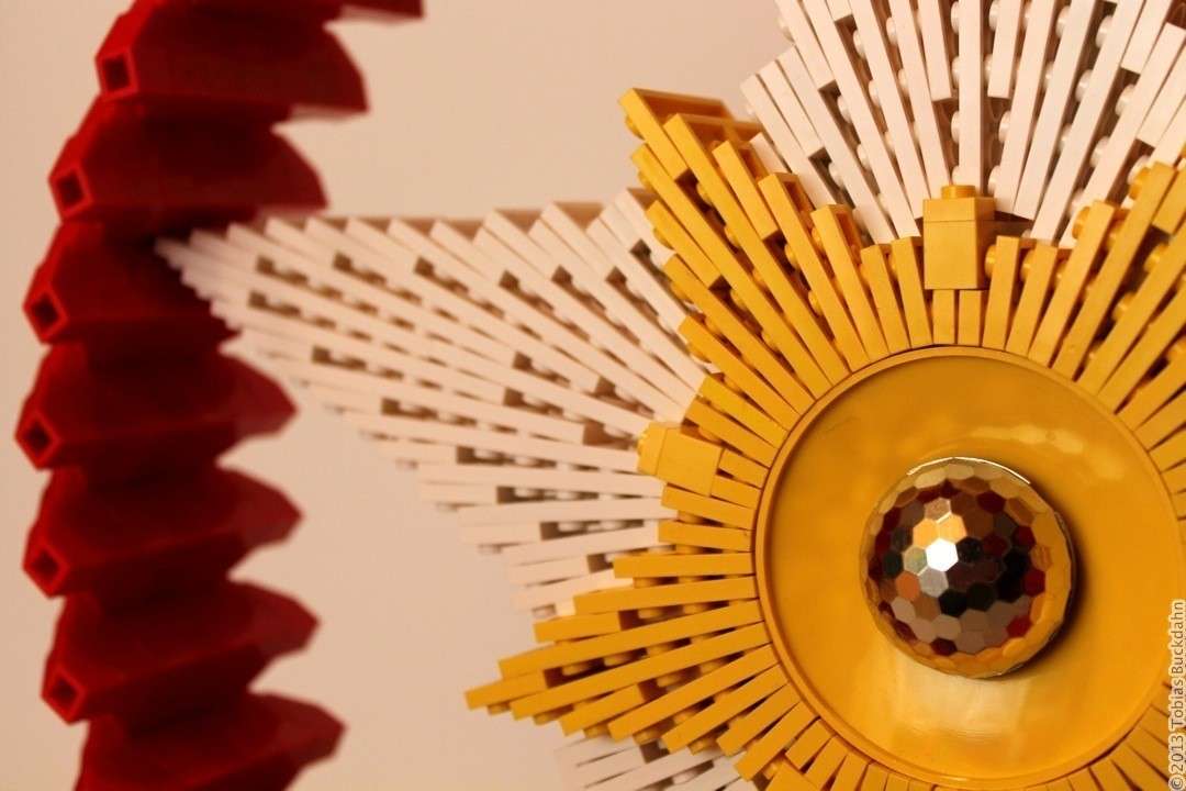 Ganz anders jedoch dieses Modell: Hier bin ich überrascht, dass es mir nicht beim Bauen explodiert ist. Der äußere Ring steht unter großer Spannung, um die fragile Konstruktion im Inneren zu fixieren. Jede Bewegung des Modells war ein Abenteuer für sich. Doch nun am Ende sitzt jeder Stein fest an seinem Platz … allerdings traue ich mich nicht, einen Stein wieder zu lösen.
