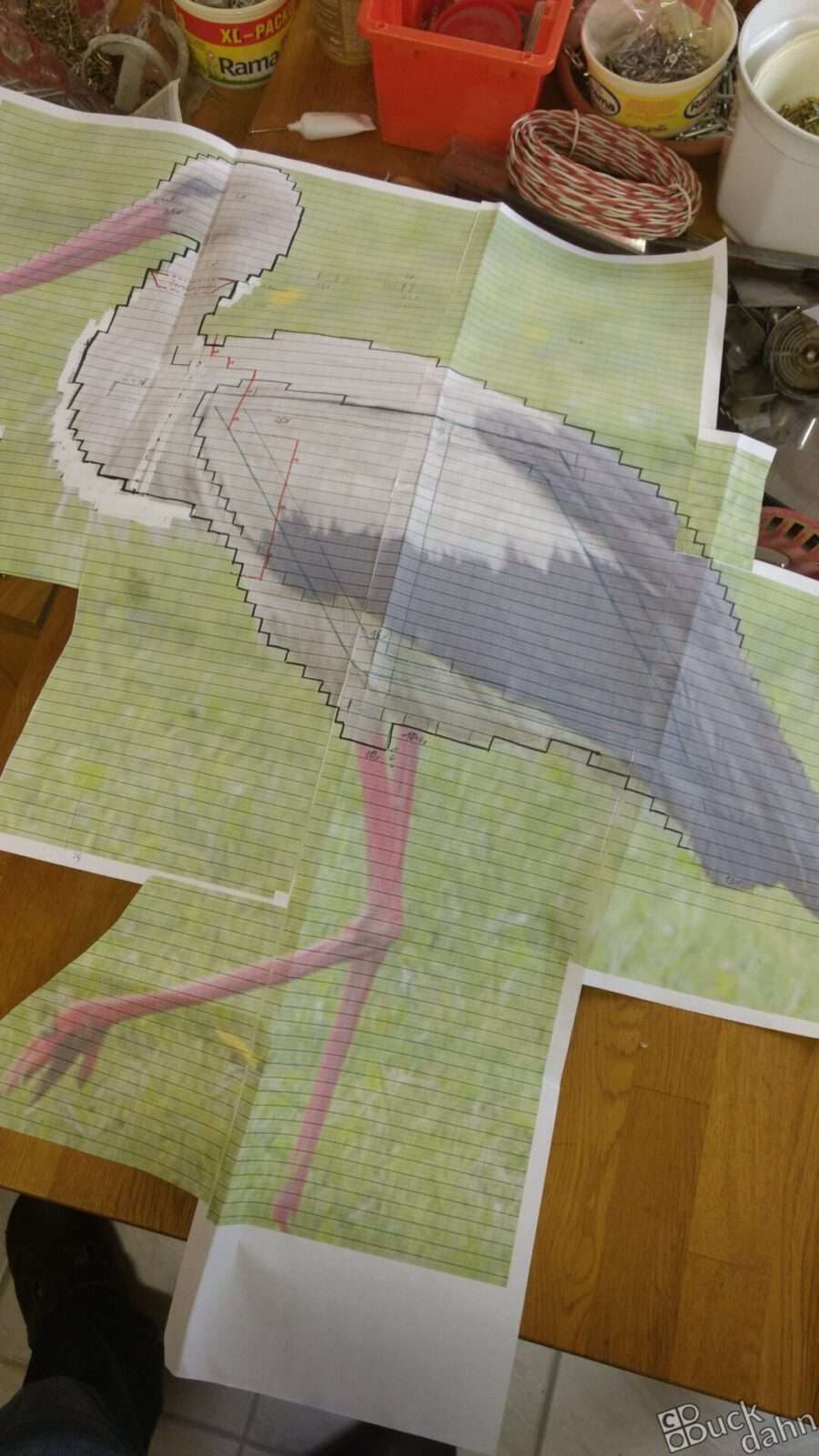 Hierfür suchte ich allerlei Fotos aus dem Internet und druckte mir eine Seitenansicht in Originalgröße aus. Auf Basis des damit erstellten Umrisses ging es an die Planung des Metallgestells. Dieses war zwingend erforderlich, da die Beine viel zu lang und dünn für eine selbsttragende Legokonstruktion sind.