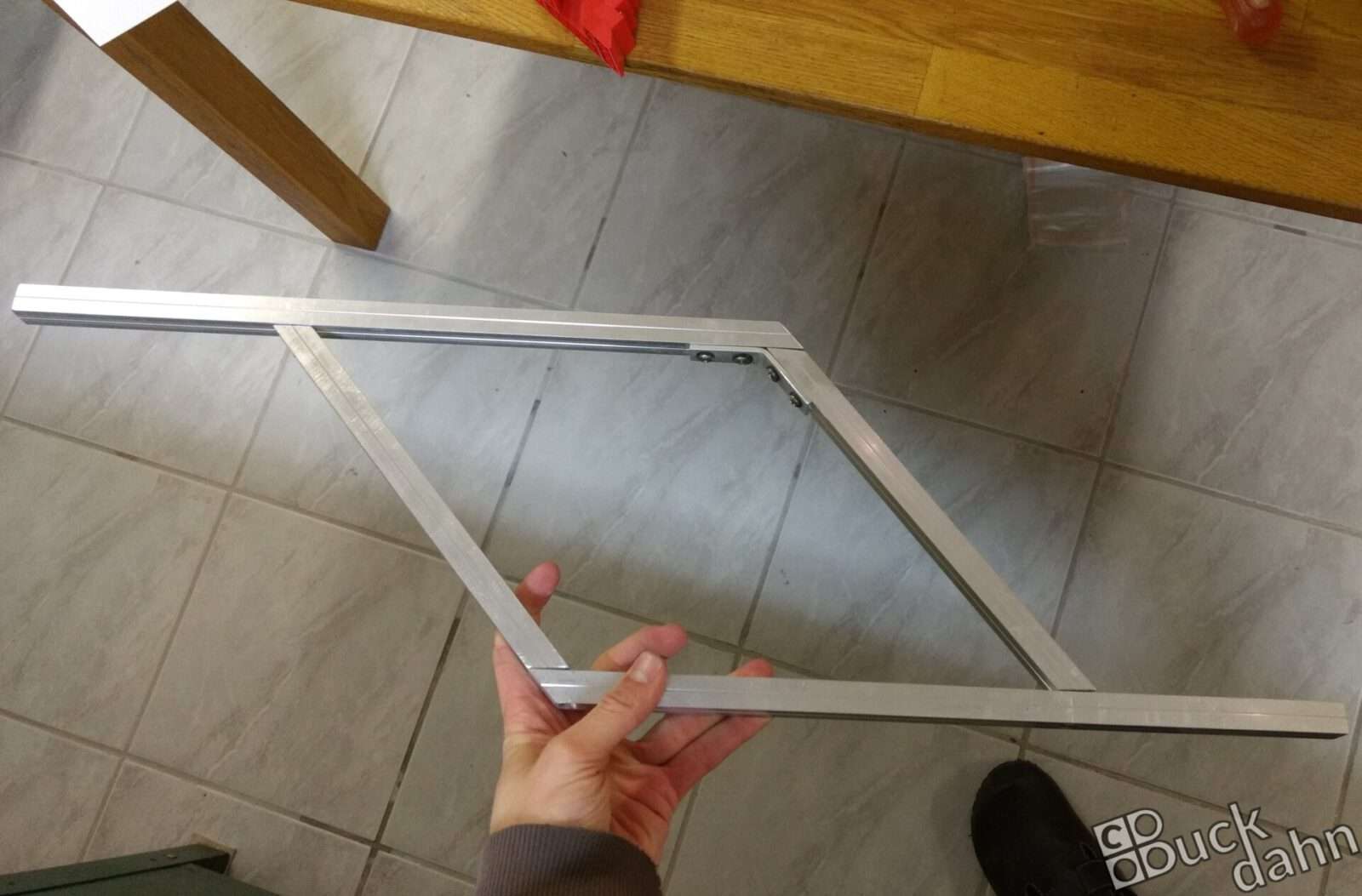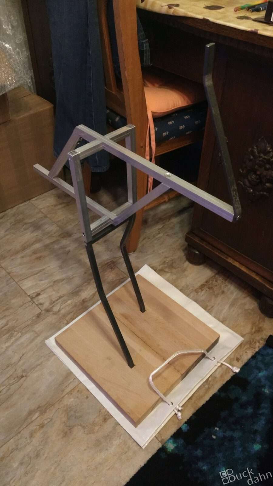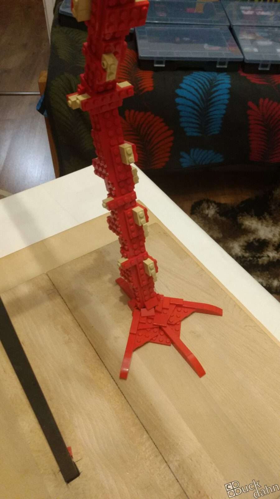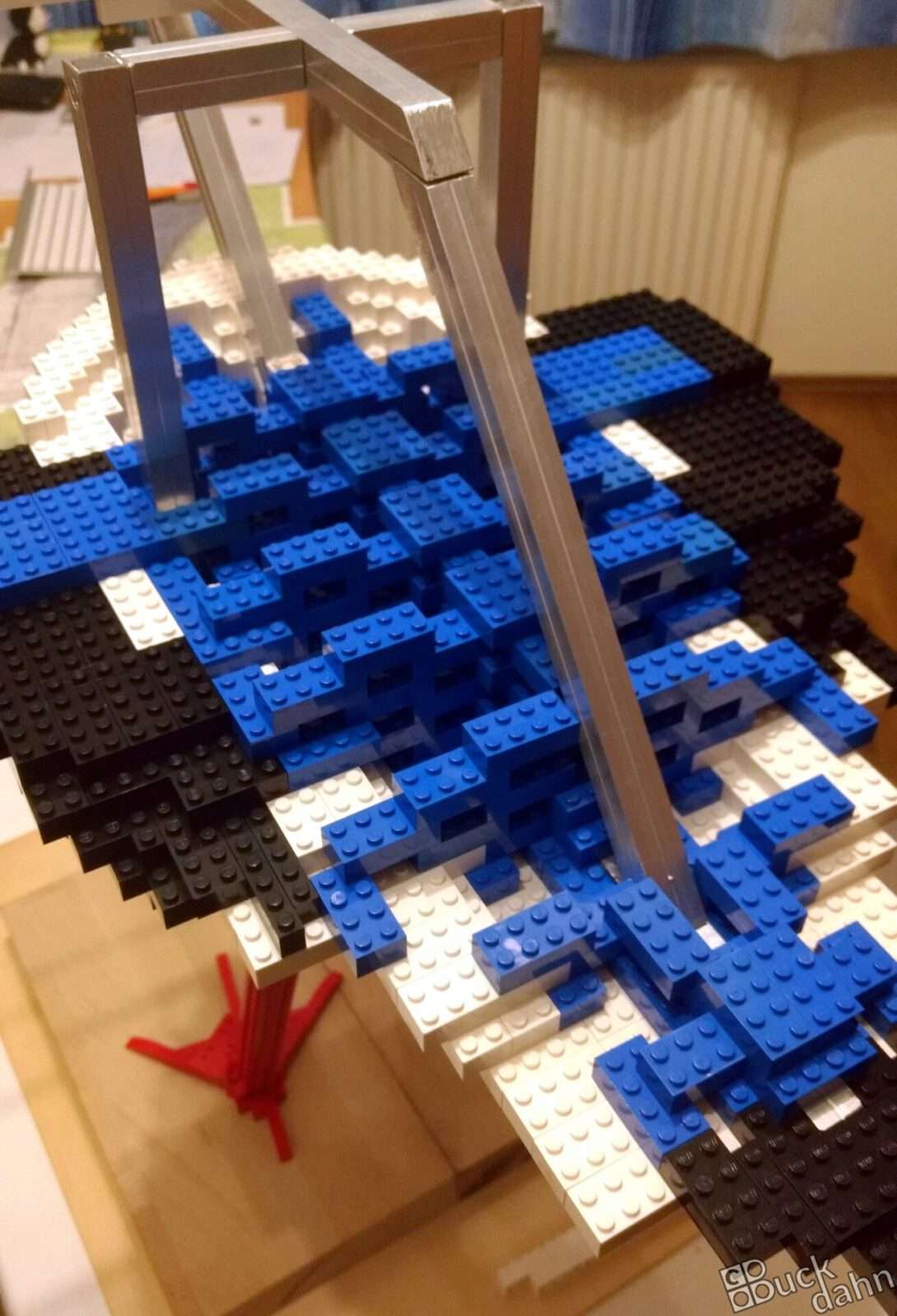 So baute ich zusammen mit meinem Vater über die Weihnachtsfeiertage im heimischen Bastelkeller an einem grundsoliden Metallgestell aus Aluminium und Stahl. Als Grundplatte dient ein massives Holzbrett. Mit dieser Konstruktion düste ich nach dem Jahreswechsel glücklich in meine Wohnung und setzte mich an das eigentliche Werk: Den Bau der Legoskulptur.